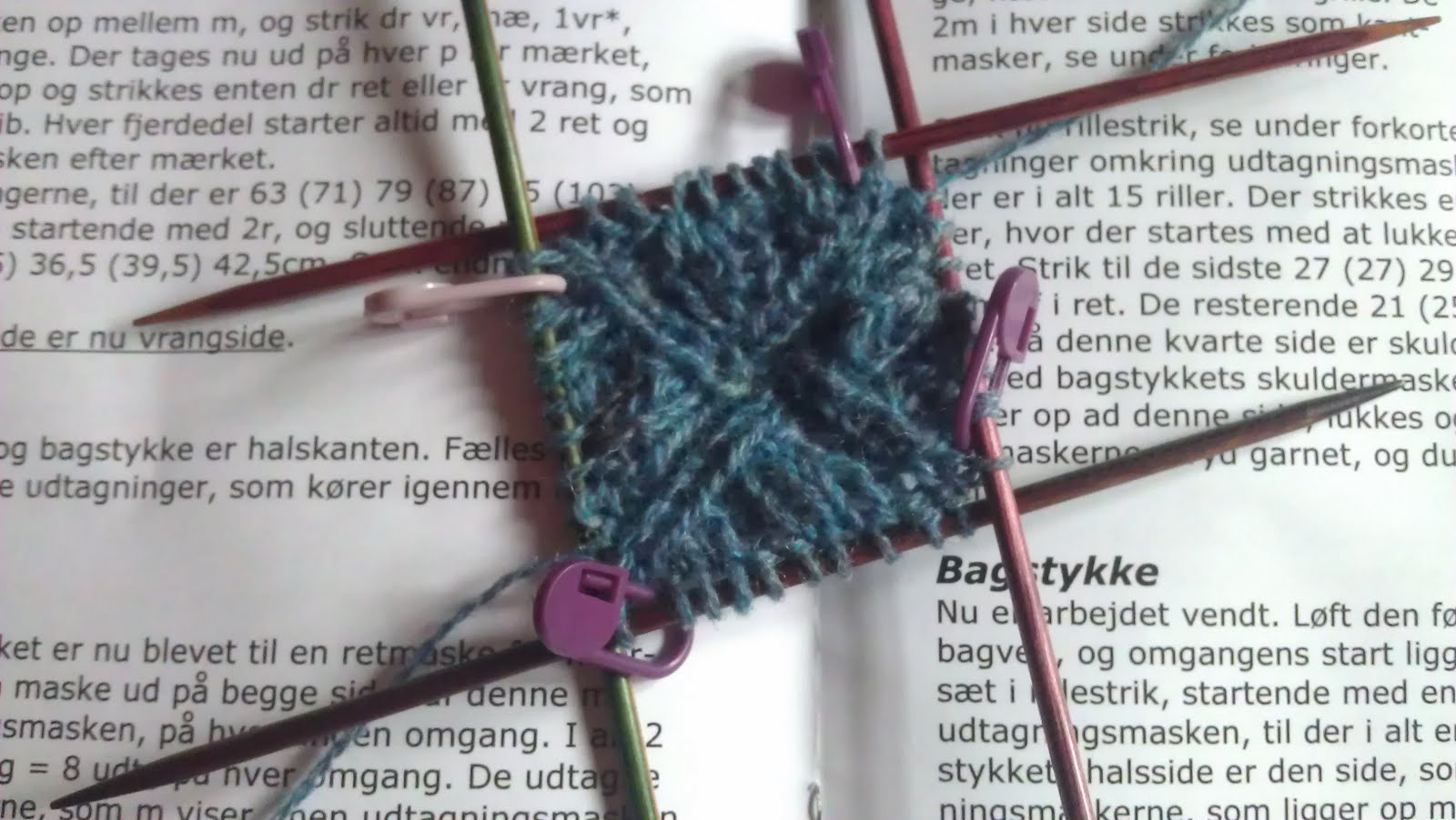 Nu har jeg ferie og i dag er der dømt afslapning… Det betyder læsning, leg, kortspil, badning, film og for mit vedkommende også lidt strik. Jeg er startet på Rundstykker fra Geilsk. Købte garn og opskrift på strikkefestival på Fanø forrige år…